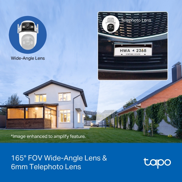- Wide-Angle & Telephoto Lens - With 165° FOV wide-angle lens and 6mm telephoto lens, it ensures all-around awareness and down-to-the-detail protection of your home.