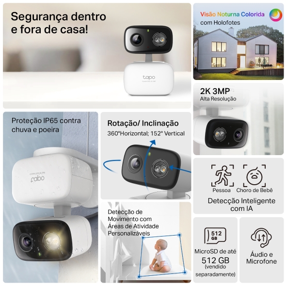 - Armazenamento local e em nuvem: salve vídeos gravados em um cartão microSD (até 512 GB) ou utilizando o serviço de armazenamento em nuvem Tapo Care.
