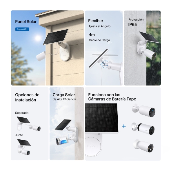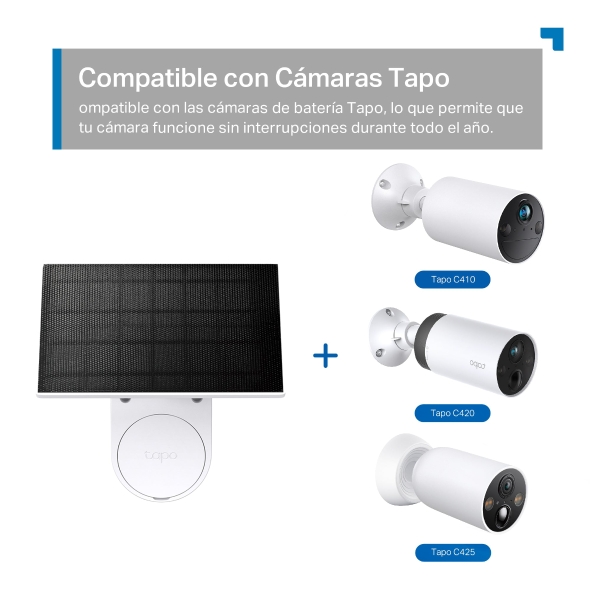 Compatible con todas las cámaras con batería Tapo1, lo que permite que tu cámara funcione sin interrupciones durante todo el año.