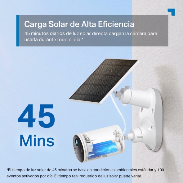 - Alimentación Ininterrumpida. Carga solar de alta eficiencia. Solo necesitas 45 minutos de luz solar al día para que tus cámaras sigan funcionando.2