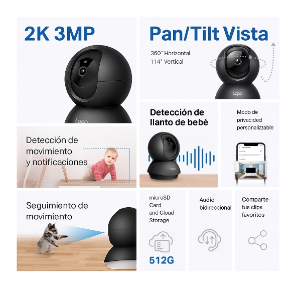 - Detección y Notificación Instantánea: Recibe notificaciones automáticas cuando se detecta movimiento o una persona, suscríbete a Tapo Care para la detección de llanto de bebé.