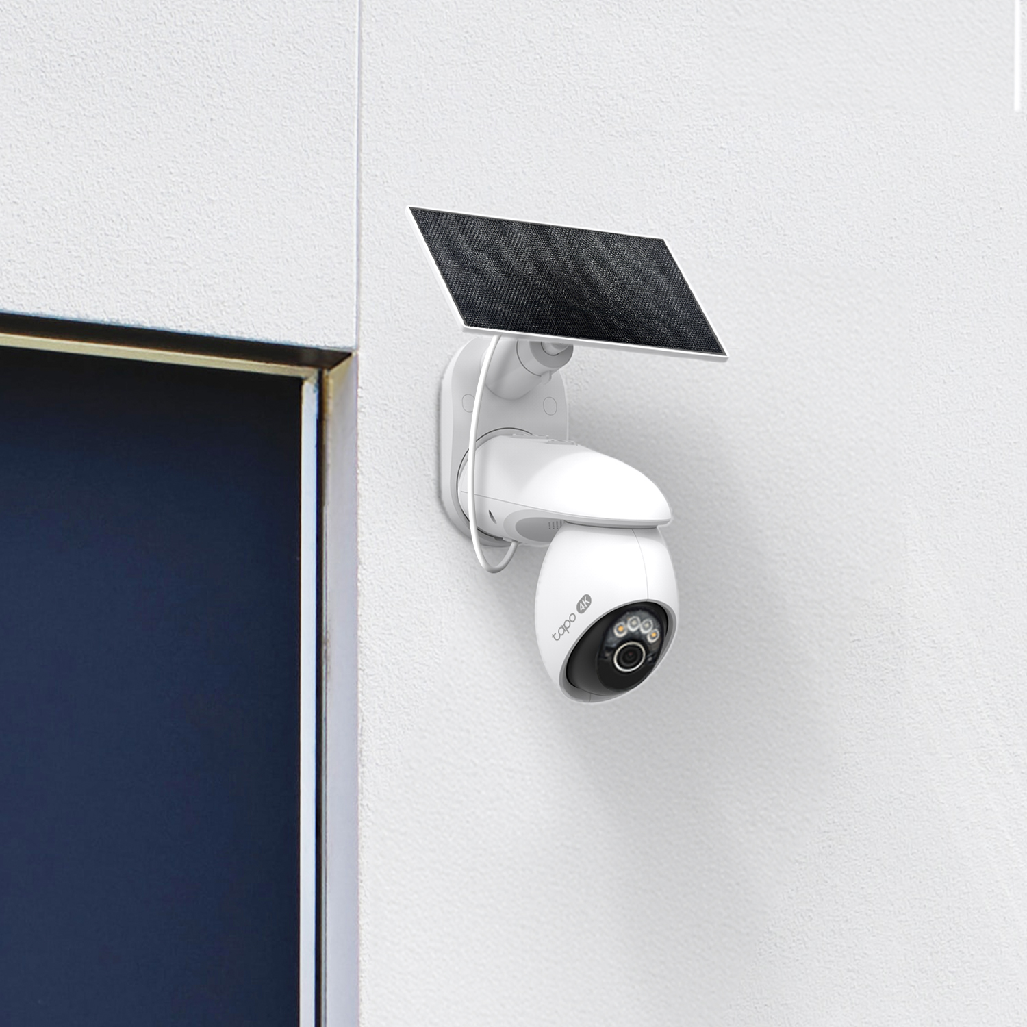 For a simpler, all-in-one 4K solar setup, the Tapo C465 integrates the solar panel directly into the camera body. There are no separate panels to position or cables to route. The adjustable built-in panel and rotating lens ring let you angle the solar panel for optimal charging. It's a practical starting point if you want solar convenience without extra hardware. The C465 carries an IP65 rating and includes free AI-powered detection, local microSD storage support (sold separately), and two-way audio.