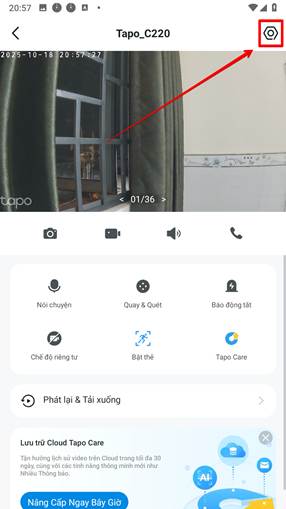 Bước 1: Trên trang Xem Trực Tiếp, chạm vào biểu tượng bánh răng ở góc trên bên phải để vào trang Cài đặt Thiết bị.